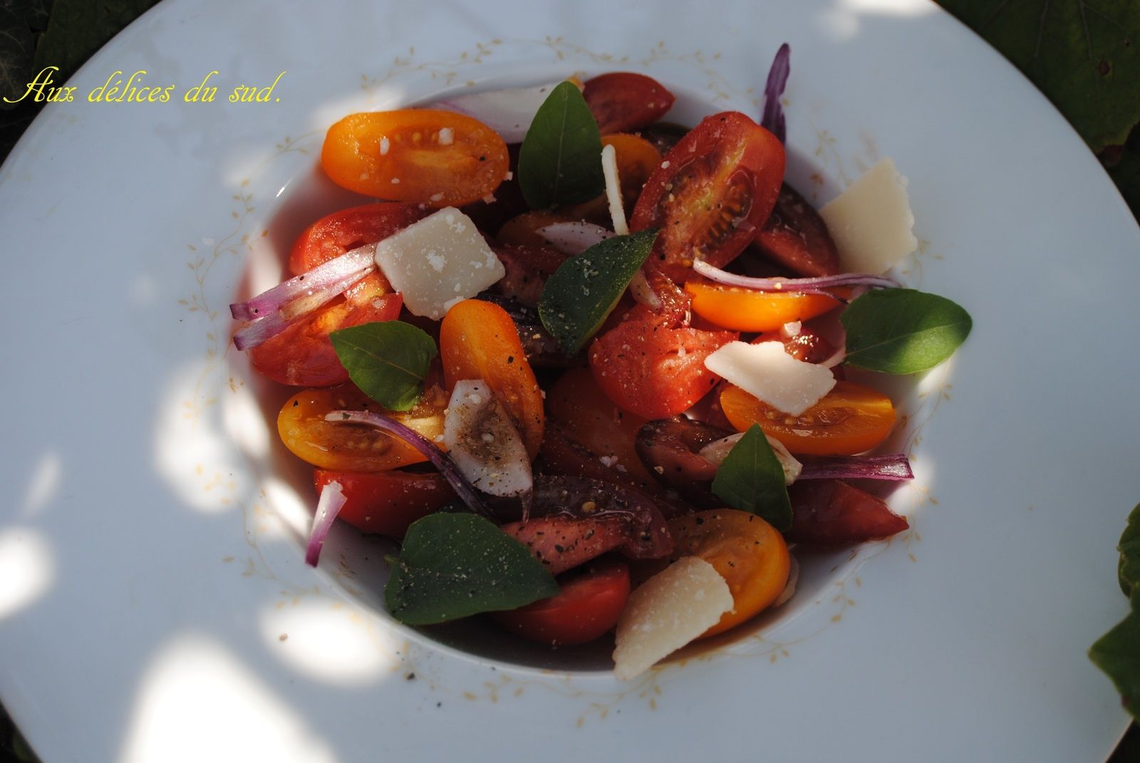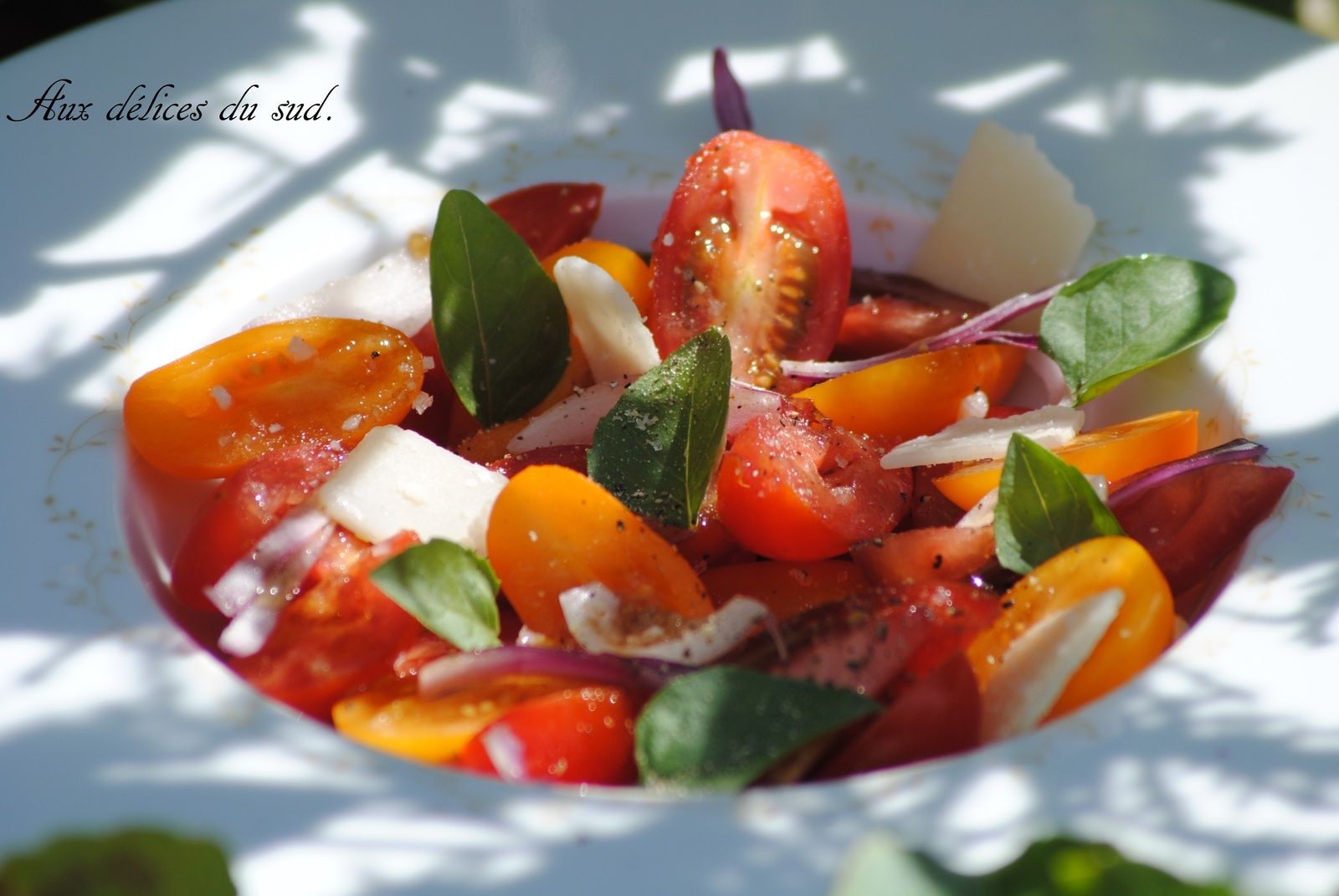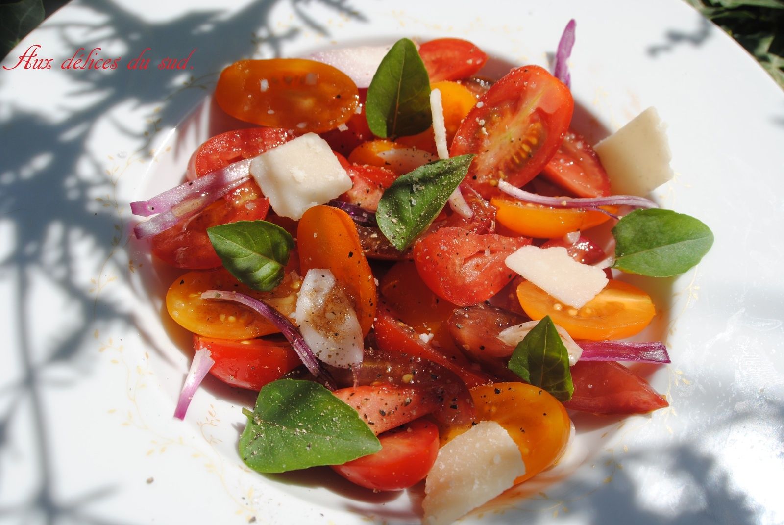 300 gr de tomates olives bicolore , 4 petites tomates crimée ,4 petites tomates roma , 4 petites tomates marmande , basilic, quelques pétales de parmesan , 2oignons rouge italien , fleur de sel , vinaigrette au vinaigre balsamique , ,poivre du moulin .