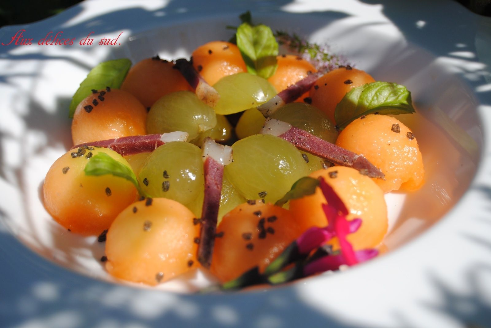 1 beau melon bien mûr , 1 grappe de raisin , quelques feuilles de basilic frais du jardin , quelques tranches de magret de canard fumé maison , crème de balsamique, sel noir d'hawaï .