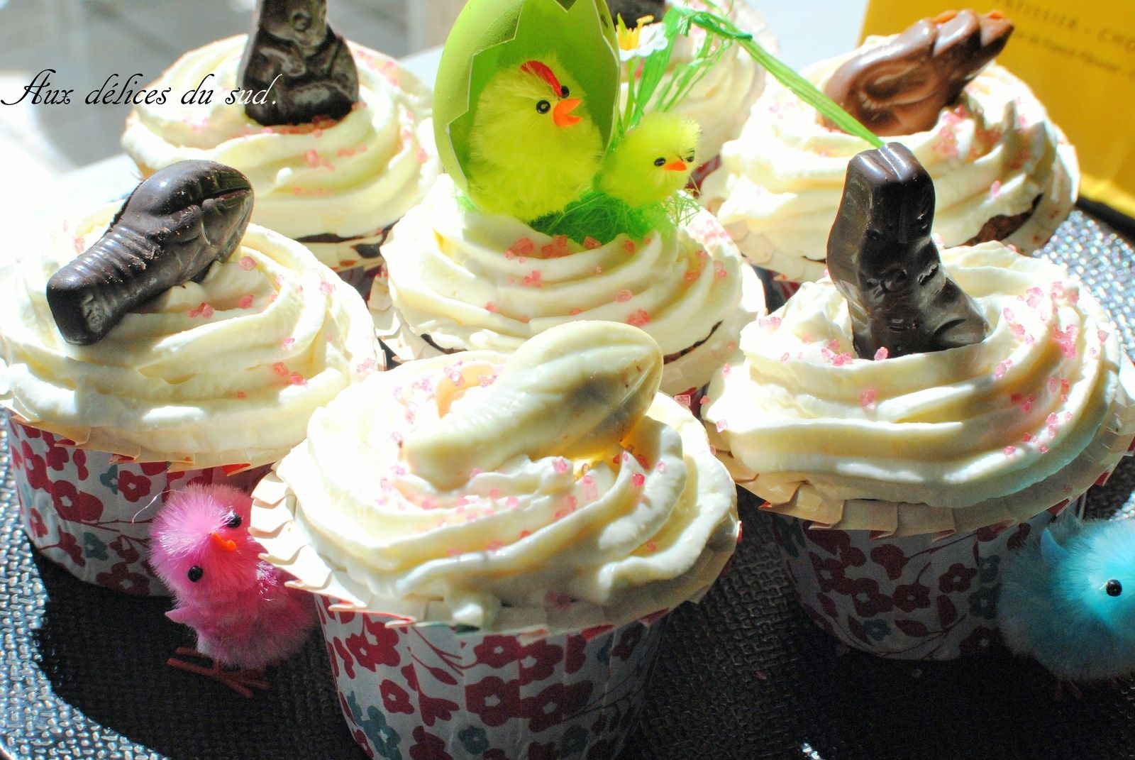 Découpez le haut des cupcakes .Puis garnir le dessus de crème ,saupoudrer de sucre de barbe à papa .Déposez sur les cupcakes un sujet en chocolat , puis mettre au frais jusqu'au moment de dégustation .