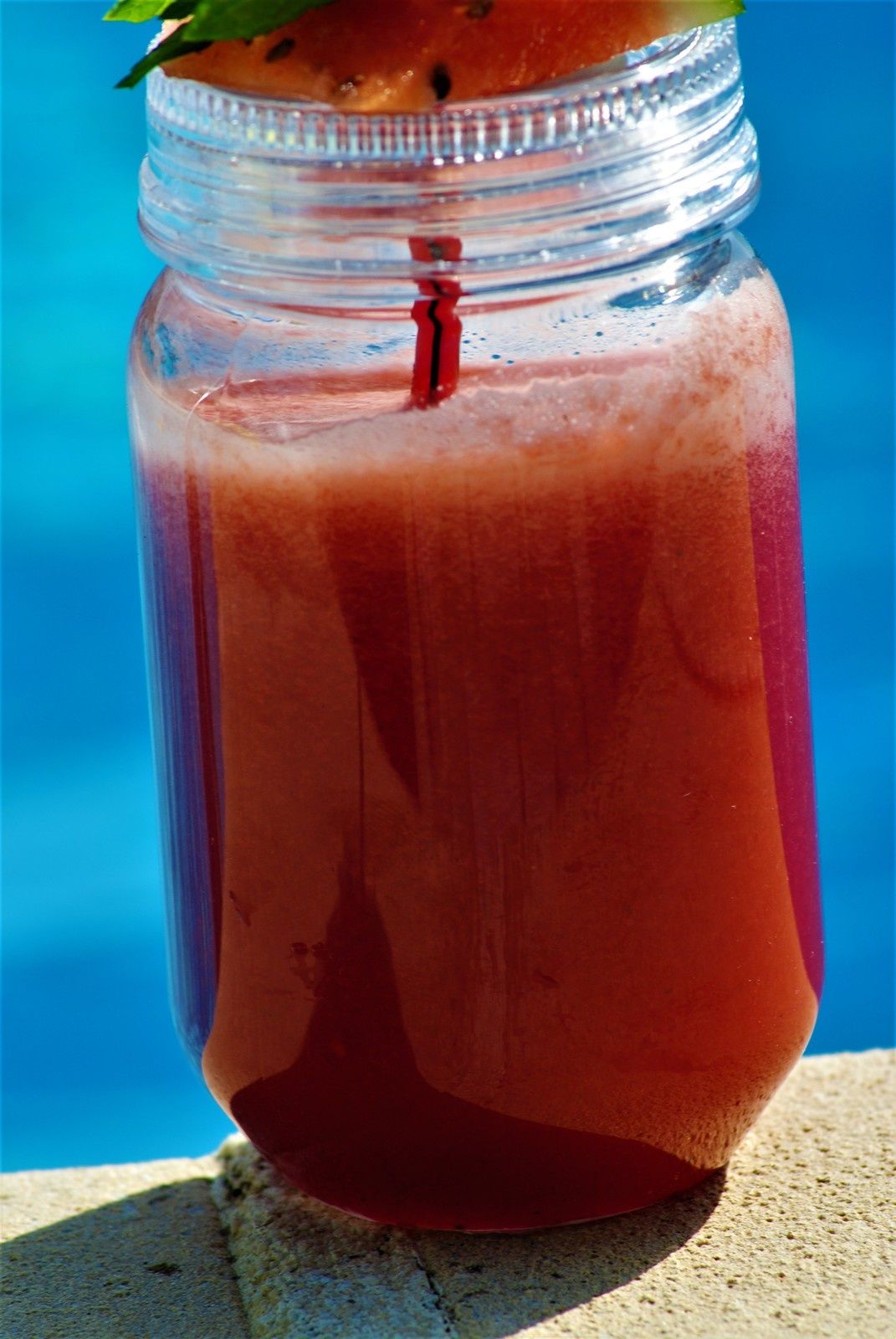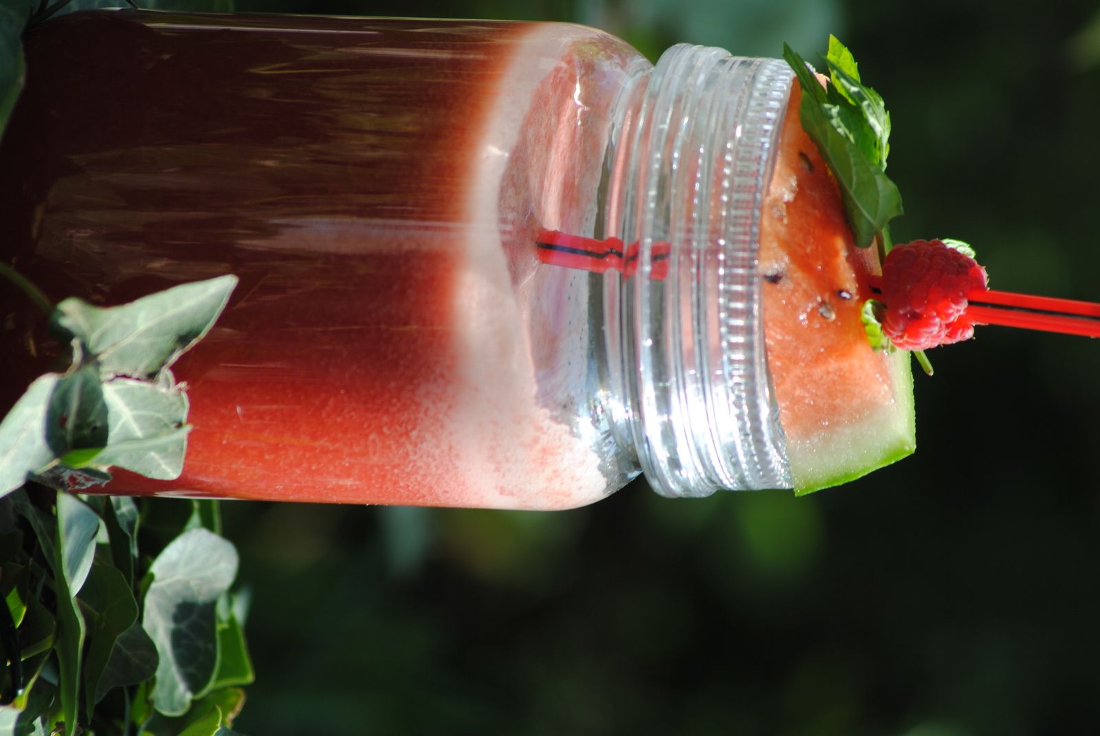 700 gr de pastèque sans pépins , 300 gr de framboises , 3 tiges de menthe , le zeste de 1 citron jaune bio , 1/2 verre de sirop sans sucre au pamplemousse de TEISSEIRE , 30 cl d'eau , 3 c à s de sirop d'agave .