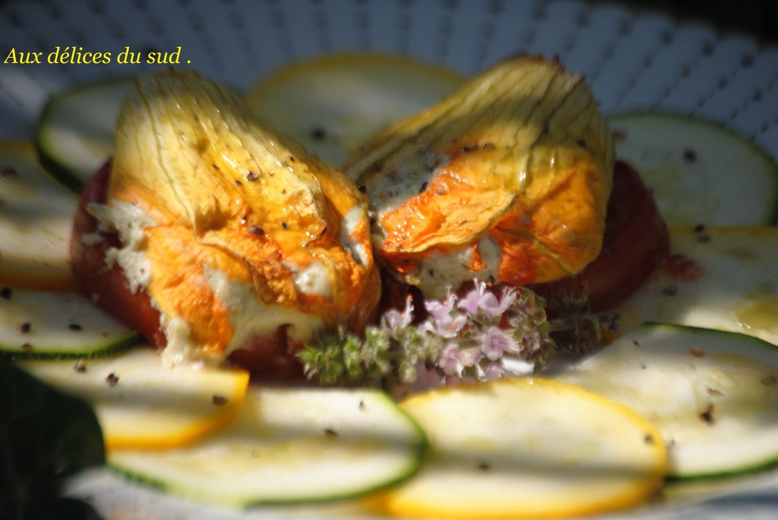 Coupez les courgettes avec une mandoline , les disposez sur une assiette en intercalant les couleurs , mettre au centre deux fleurs de courgettes farcies et décorer de fleur de basilic . versez sur les courgettes un filet d'huile d'olive salez et poivrez .