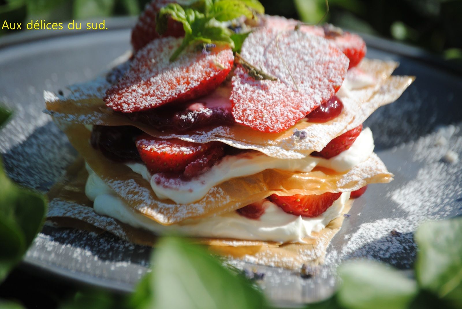 6 feuilles de filo , 250 gr de fraises , 500 gr de Gervita , 40 gr de beurre , 2 c à s de jus de citron jaune bio , 30 gr de sucre en poudre pour confiture ,1 c à s de sirop de vanille , quelques feuilles de menthe , 2 c à s de sucre neige pour le décor , quelques fleurs comestibles .