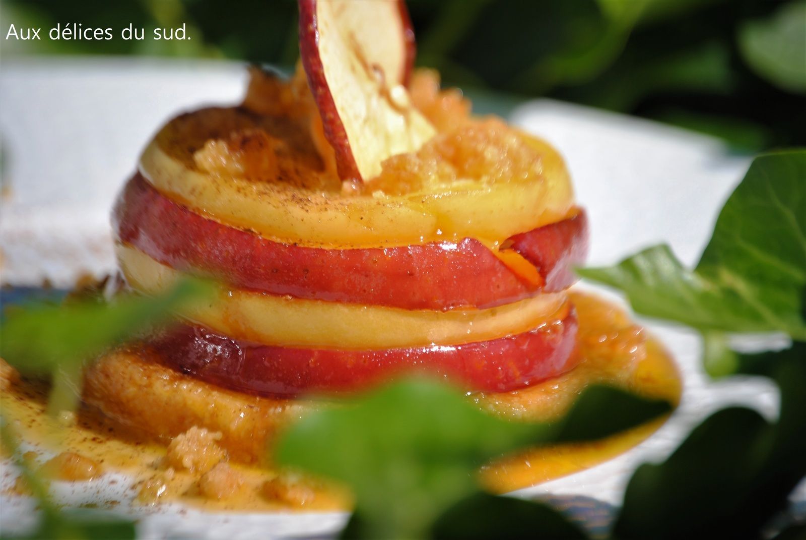 Démouler les bases de biscuits et empilée les tranches de pomme en intercalent les couleurs . Versez 1 ou 2 c à s de sirop de la cuisson des pommes , sur les tourelles , saupoudrez-les de cannelle . Décorer avec une tranche de pomme séchée et saupoudrer les assiettes d'un peu de pâte aux biscuits .