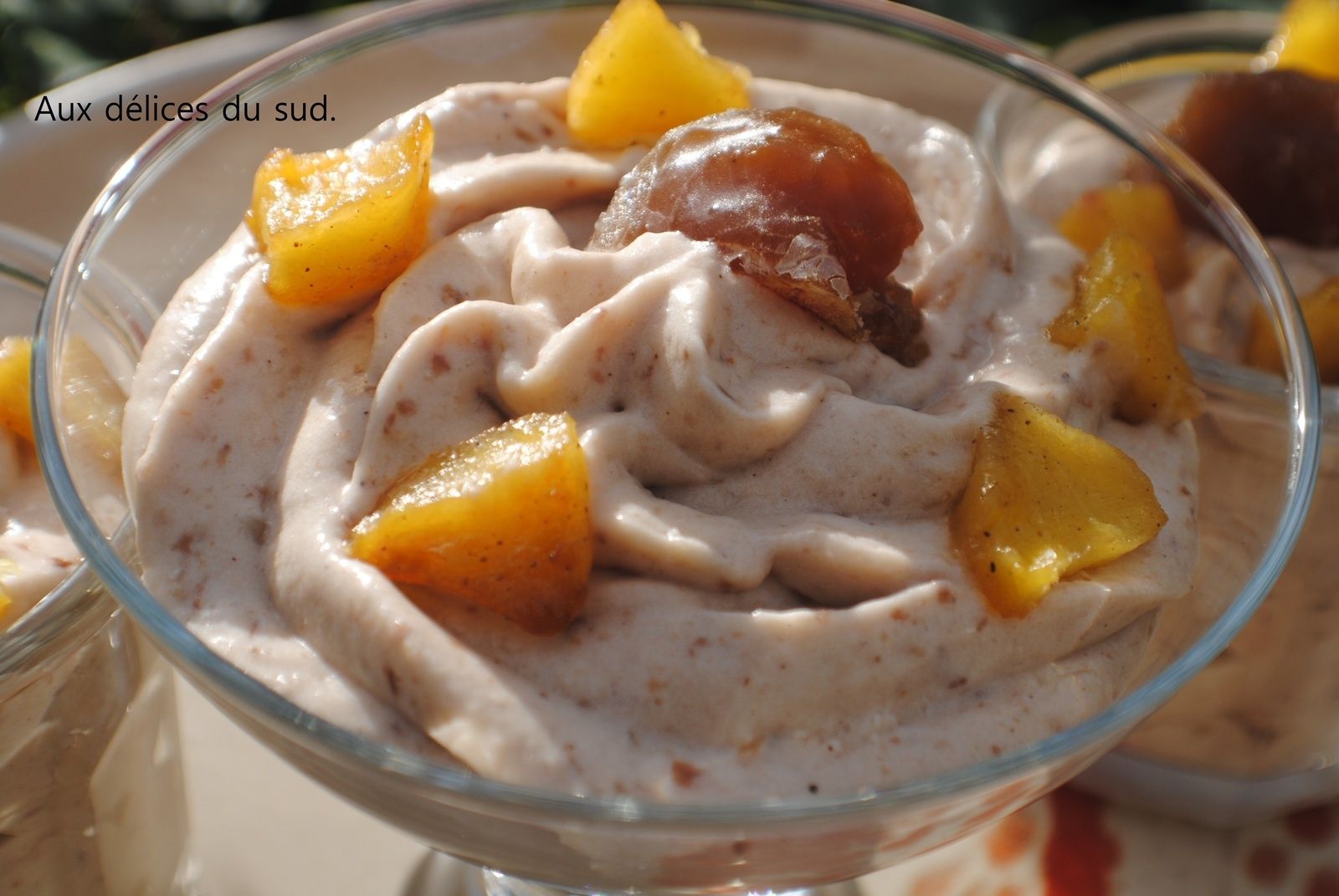 1 pot de confiture de marron à la vanille maison , 2 feuilles de gélatine , 20 cl de crème liquide entière à 30% , 1 c à s de mascarpone , , 3 pommes , type golden , 1 noix de beurre , 1 c à s de sucre complet muscovado , 1 pincée de poudre de vanille , 4 marrons glacés .